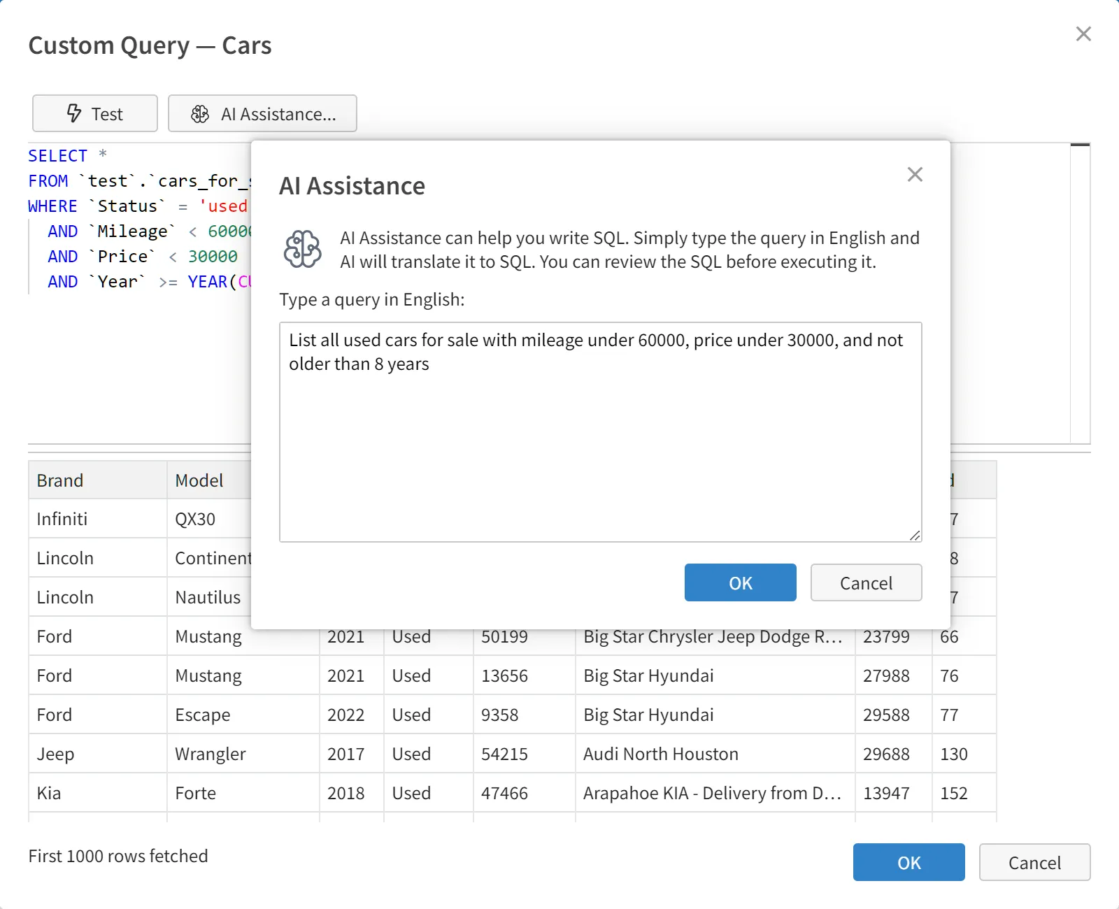 Queries are the fundamental way to request and retrieve specific data from a database. The AI-assisted query builder in Visual DB enables users without deep SQL knowledge to create data queries through a user-friendly visual interface. Simply describe what you want in plain English (or another language), and we'll translate it to SQL for you.